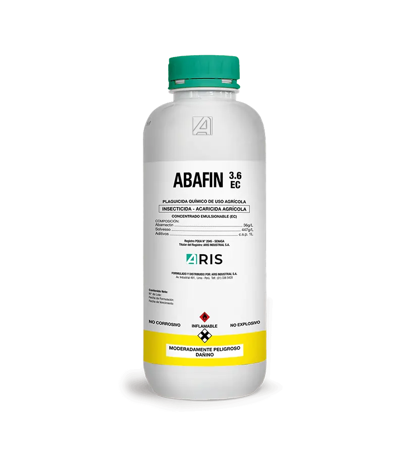 ABAFIN 3.6 EC es un insecticida-acaricida de doble concentración formulado para un control más eficaz desde la primera aplicación. Su alta potencia y elevado poder solvente permiten reducir el volumen de empaque, optimizando el espacio de transporte y almacenamiento. Es especialmente efectivo en el control de ácaros, moscas minadoras, trips y pulgones.