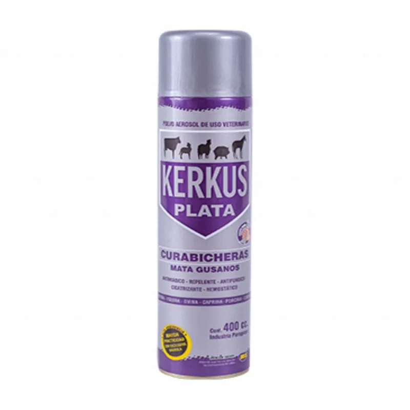 Curabichera Kerkus Plata es un spray de acción múltiple que favorece la cicatrización y repele las moscas. Se utiliza en el tratamiento preventivo y curativo de bicheras en heridas de bovinos, equinos, ovinos, caprinos, porcinos y caninos. Posee propiedades larvicidas, antimiasis, hemostáticas y cicatrizantes, por lo que puede aplicarse en animales de cualquier edad, incluso recién nacidos. Previene la miasis en procedimientos rutinarios como cirugías, ombligo, descornes y descoles. Forma una película protectora que controla el sangrado y su color plateado permite identificar qué animales han sido tratados.