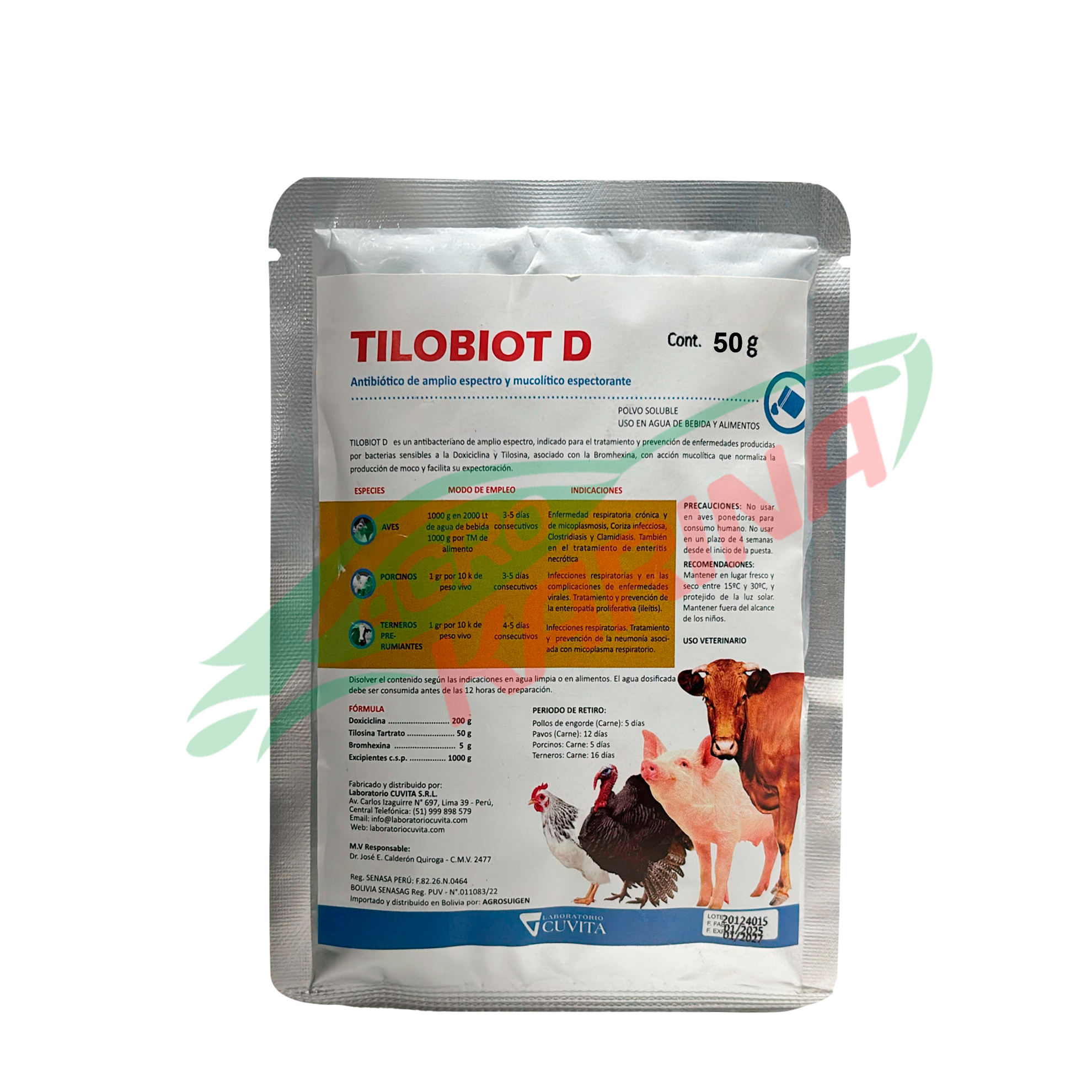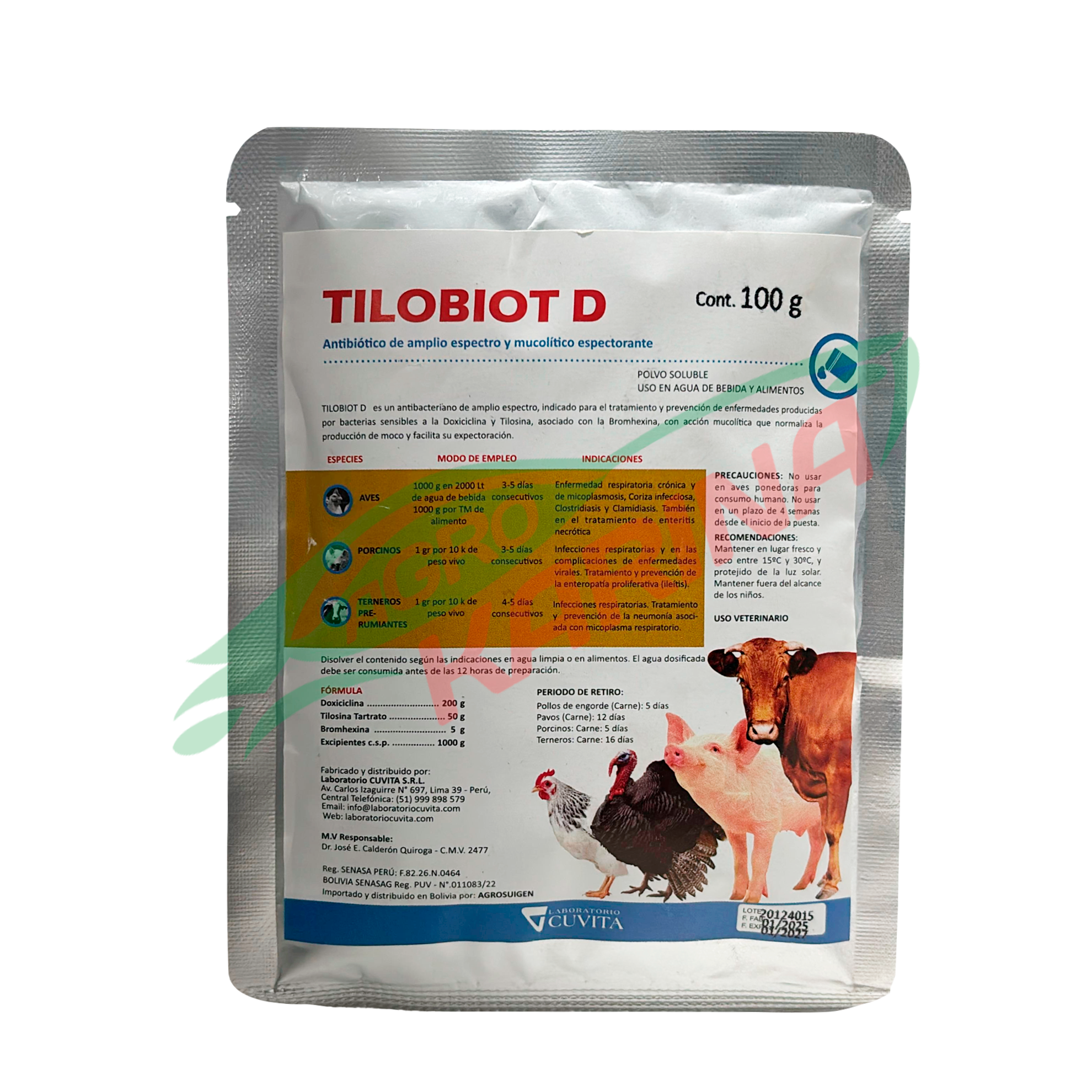 Asociación antibiótica de amplio espectro (doxiciclina + tilosina) con acción bacteriostática. Indicada para tratar y prevenir diversas enfermedades causadas por bacterias sensibles.